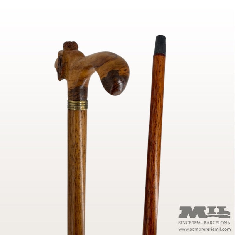 Bastón Caniche de Finna está al completo fabricado con madera de olivera hecho a mano en España. Puño con diseño de cabeza de un perro raza Caniche y contera con un tapón de madera. Es un bastón para coleccionistas pero si se quiere para un uso propio en tienda se lo ajustan a la altura preferente.