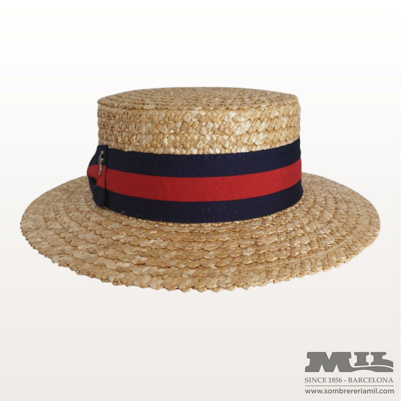 Canotier Fléchet perfecto para protegerte del sol dando un toque de estilo a tu día a día. El canotier, gondolero o veneciano es un sombrero de copa recta y plana y ala corta, plana y rígida. Este canotier rígido unisex está fabricado en paja natural, luce una ancha cinta de color azul marino y rojo .