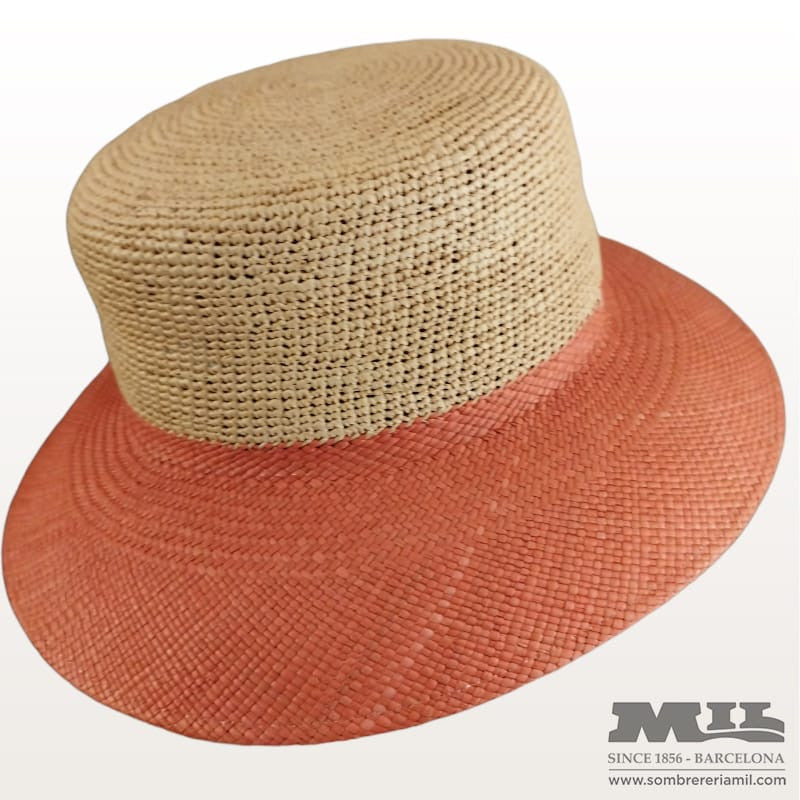 Este modelo combina la copa en color natural y forma cuadrada, elaborada a crochet con una ala en tono naranja, con el trenzado artesanal de la paja toquilla Carludovica Palmata.