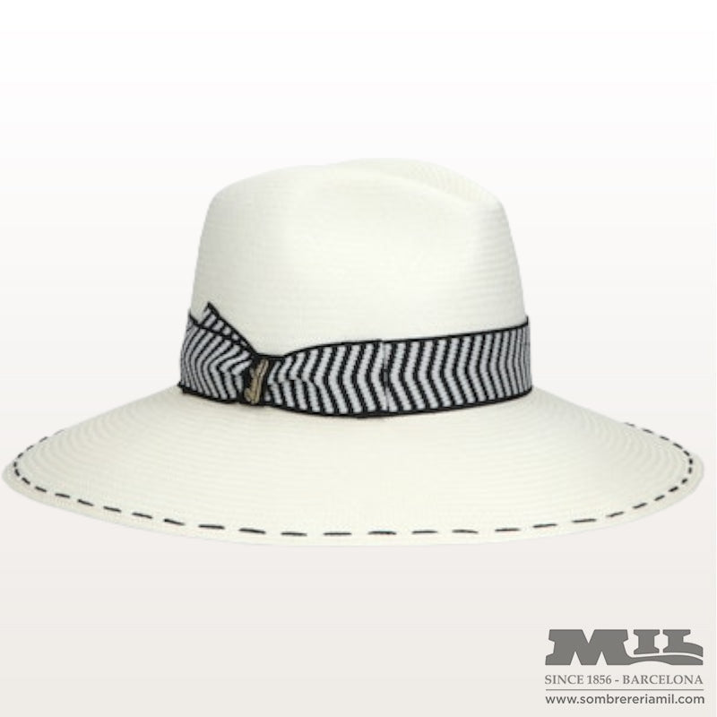 El modelo Panamá Sophie es un sombrero hecho de 100% de paja toquilla y trenado en Ecuador por expertos artesanos. El modelo cuenta con una copa fedora y con una ala ancha de 10cm y una cinta chevron de 4cm. Los pespuntes en el borde del ala hacen que el diseño con la cinta cobre sentido y de un efecto muy moderno pero a la vez elegante.