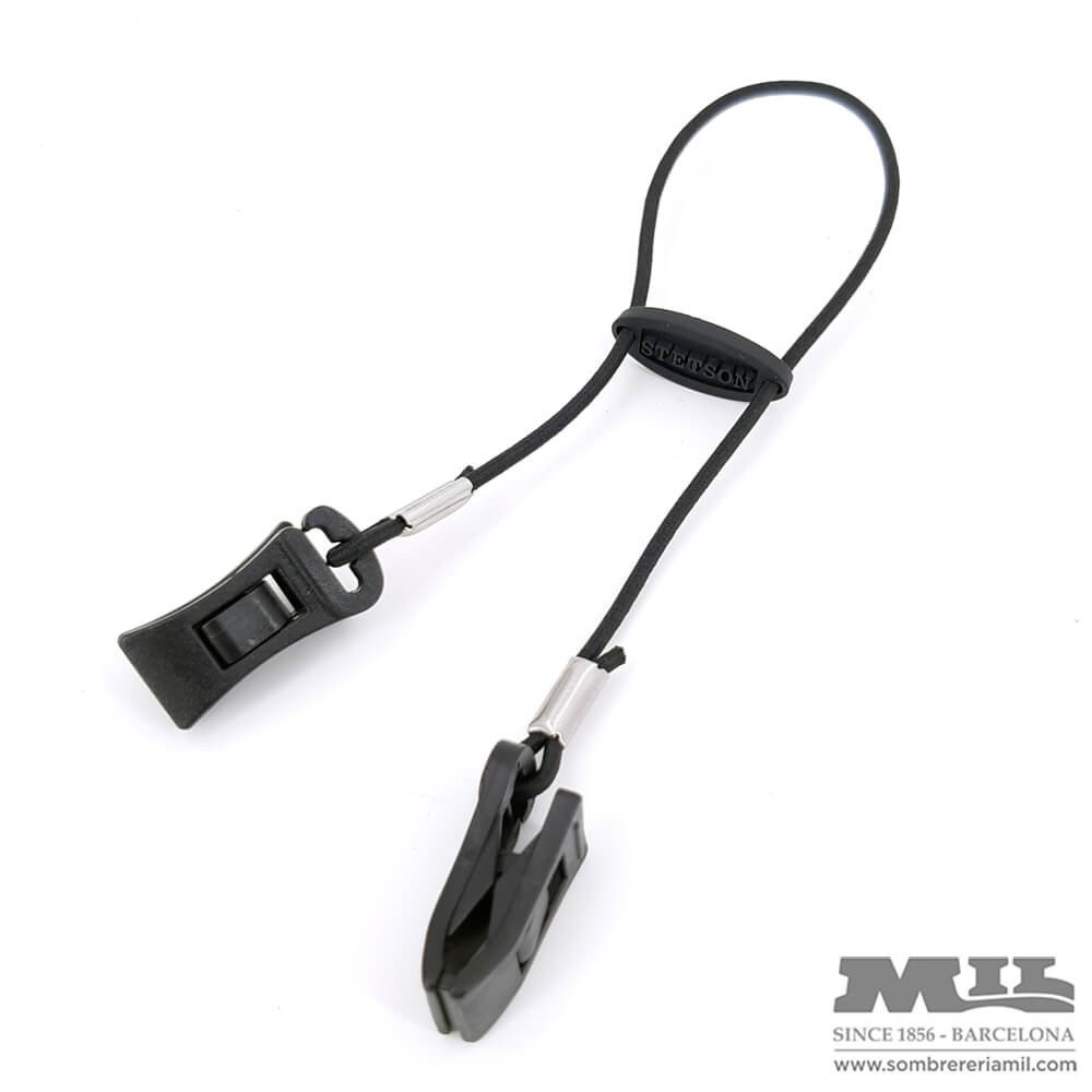 Pinza antiviento para evitar que tu sombrero salga volando. Fija un extremo al sombrero y el otro al cuello de tu camisa. Úsala también par colgar tu sombrero.