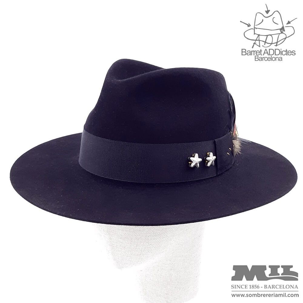 Sombrero de ala ancha y plana de 7'5cm y una copa tipo fedora de 10cm de altura. Fabricado en nuestro taller BarretAddictes a mano con fieltro de pelo de primera calidad. Fabricado por encargo si la talla aparece agotada, en este caso el período de fabricación es de 10 a 15 días laborables. Por cualquier duda contacta con nosotros.