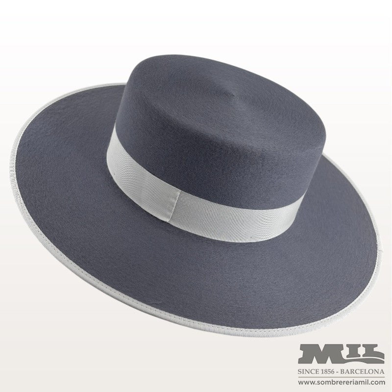Sombrero Cordobés Sevillano de Fernández y Roche estilo cordobés de ala y copa plana con diseño más moderno, fabricado con fieltro de lana. La altura de la copa és de 9.5cm y la del ala 10 cm de ancho con una cita en el acabado. Además cuenta con un forro en el interior, una badana de piel y un barbuquejo de tela. ¡Ideal para las fiestas!