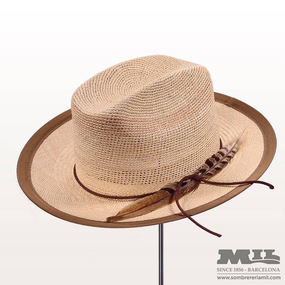 Sombrero panamá deportivo con cinta minimalista de cordón de cuero, un trenzado de paja único en la zona de la copa, ribete de tela y decoración con pluma. Máxima ventilación y transpiración en un diseño deportivo espectacular ¡No lo dudes más y hazte ya con este panamá económico con descuento que encontrarás solo en Sombrerería Mil, en Barcelona desde 1856.