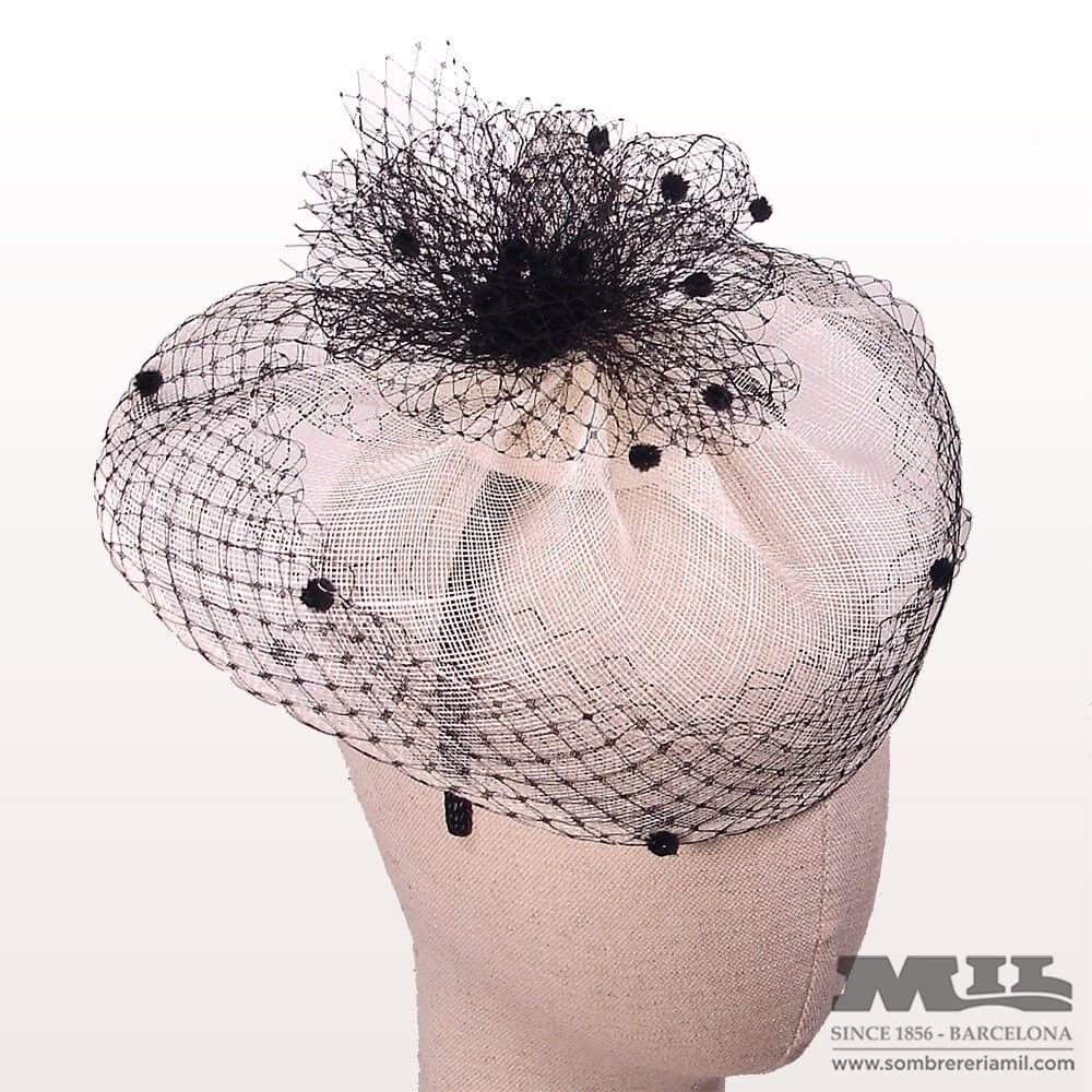 Tocado para boda, celebración, evento o fiesta de tamaño medio, forma irregular decorado con tul de color negro replegado y pequeñas bolitas de pelo sintético. Un tocado muy elegante con un toque moderno y atrevido. No lo pienses mucho y adquiere este tocado para boda online con un descuento exclusivo. Sombrerería Mil, en barcelona desde 1856.