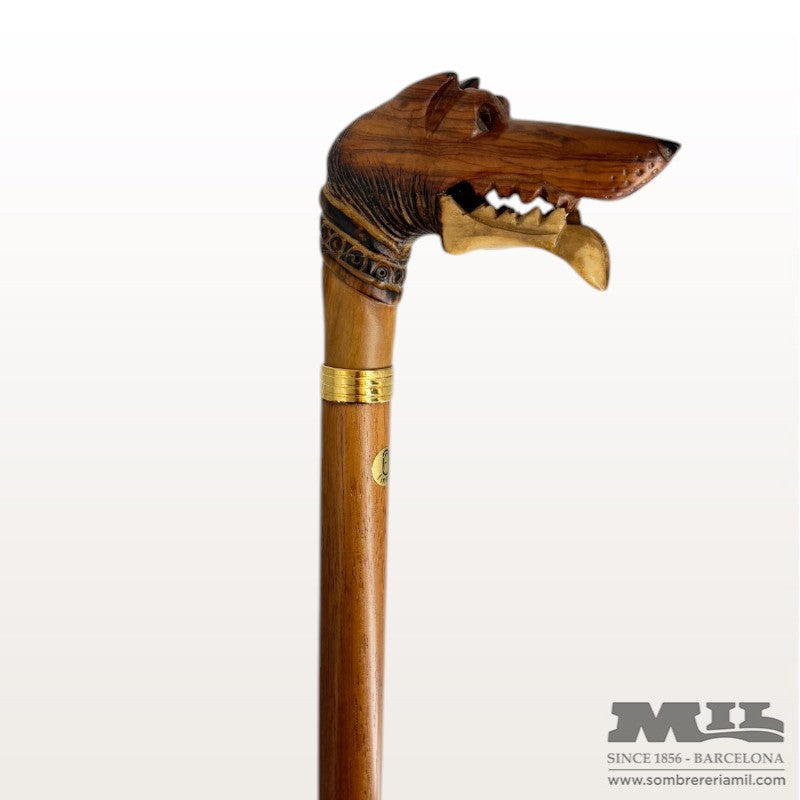 Bastón Lobo de Finna está al completo fabricado con madera de olivera hecho a mano en España. Puño con diseño de cabeza de un lobo y contera con un tapón de madera. Es un bastón para coleccionistas pero si se quiere para un uso propio en tienda se lo ajustan a la altura preferente.